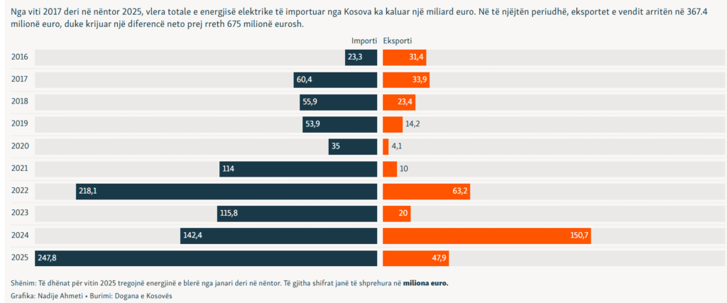 Kosova ka shpenzuar mbi një miliard euro për import të energjisë elektrike nga viti 2017 deri në nëntor 2025, duke thelluar varësinë nga tregjet e jashtme dhe duke krijuar një deficit të madh tregtar në sektorin e energjisë.