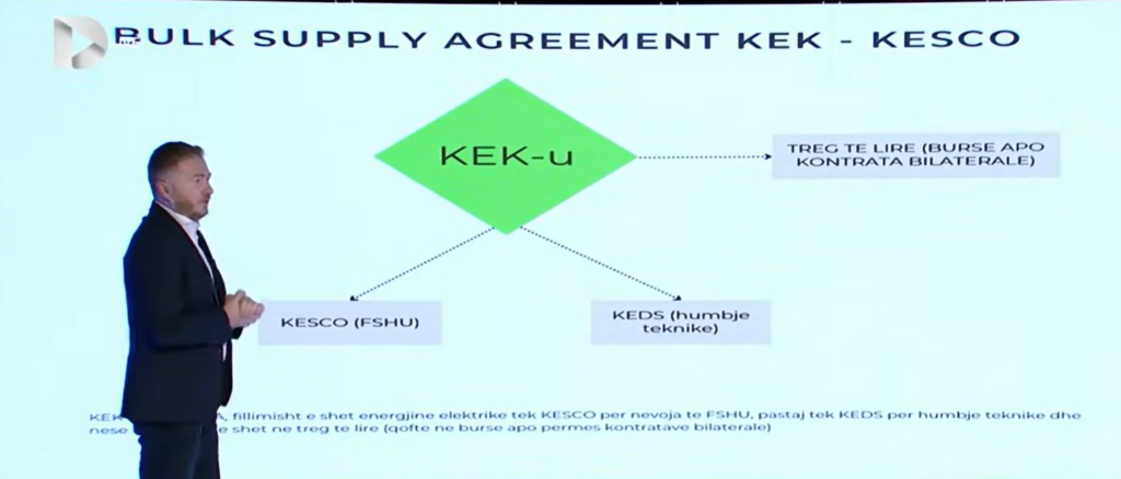 “KEK-u e ka një marrëveshje me KESCO përmes kësaj marrëveshje KEK-u obligohet që komplet energjinë me shit tek KESCO pasi e ka licencën e furnizuesit që blen me çmime të rregulluar dhe shtet me çmime të rregulluara që rregullohen nga ZRRE-ja. Pastaj, pas KESCO nëse KEK-u ka energji ende atëherë ja shet KEDS-it për të mbuluar humbjet teknike në sistem”, ka Tërnava.