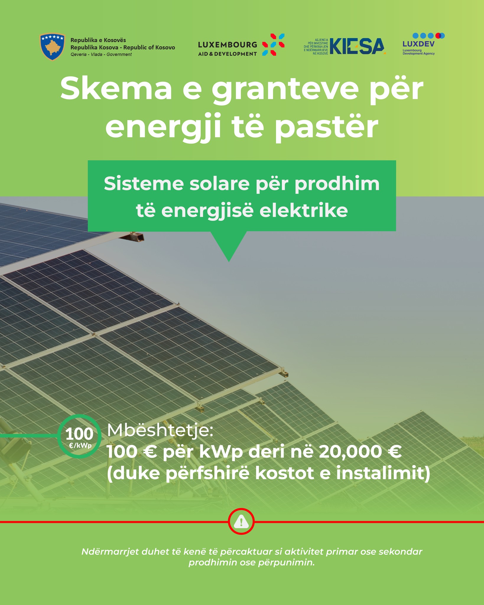 - Të jetë ndërmarrje mikro, e vogla ose e mesme (NMVM), apo të jetë ndërmarrje e madhe që përfitojn nga tarifat e rregulluara të energjisë elektrike (operon në treg të hapur);